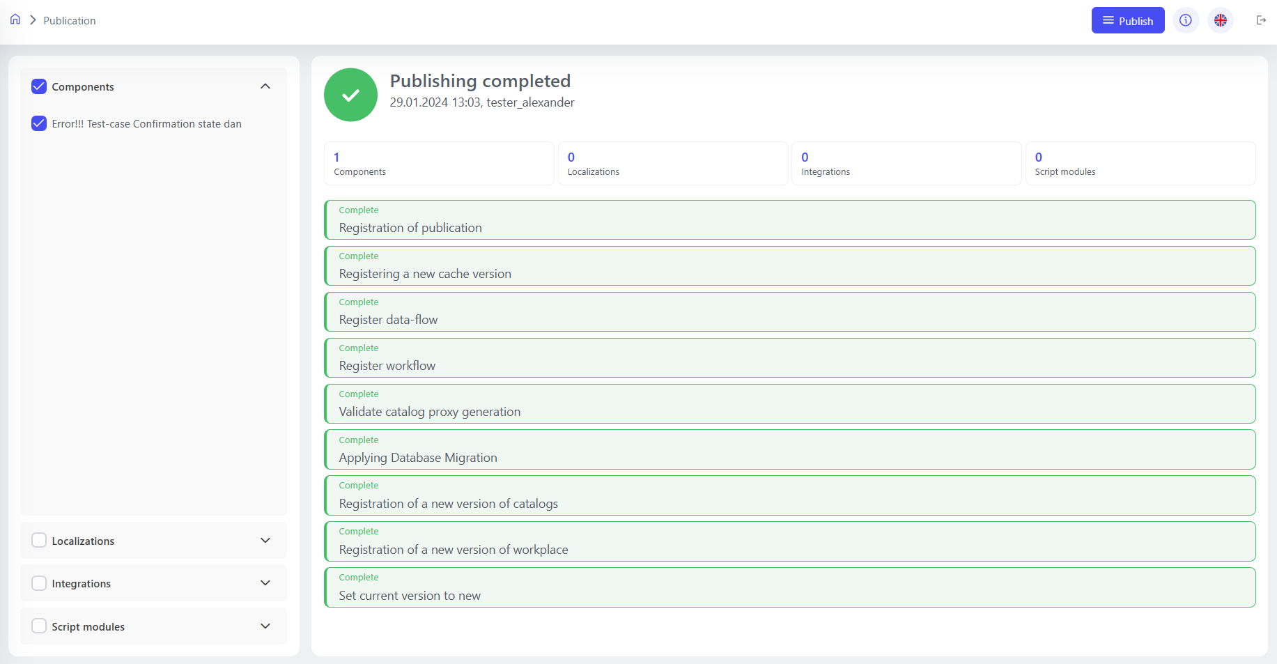 Der Veröffentlichungsprozess wird durch die Zustandsmaschine gesteuert, die es Ihnen ermöglicht, alle Phasen effektiv zu kontrollieren und im Falle von Fehlern das System in den vorherigen Zustand zurückzuführen. Eine globale Sperrfunktion wurde eingeführt, um zu verhindern, dass mehrere Veröffentlichungen gleichzeitig gestartet werden. Benutzer sehen den Status aktiver Veröffentlichungen, und nach Abschluss jeder Veröffentlichung werden die Status der Objekte, die bereit zur Veröffentlichung sind, automatisch aktualisiert.