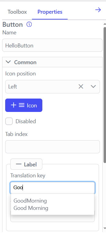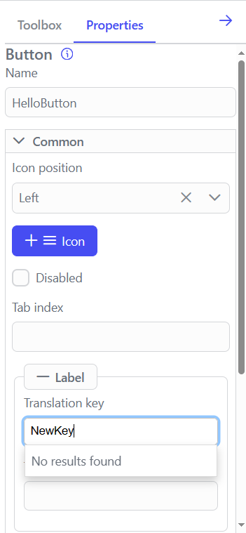 - Beim Hinzufügen von UI-Elementen zu einer Komponente können Sie einen „Übersetzungsschlüssel“ anstelle eines statischen Labels konfigurieren.