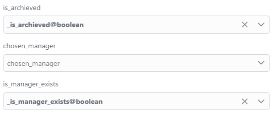 A continuación, necesitamos mapear nuestros campos. Recuerda que los campos en la configuración de pasos se mapean con el prefijo data.property_name. Para las propiedades is_archieved y is_manager_exists, utiliza los valores de variable establecidos en el paso de script de ejecución, deja el campo chosen_manager vacío: