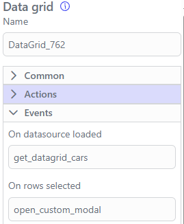 Necesita ir a la configuración de la cuadrícula de datos en el grupo de configuraciones Events, y asignar la ejecución de funciones a ciertas acciones en la cuadrícula de datos.