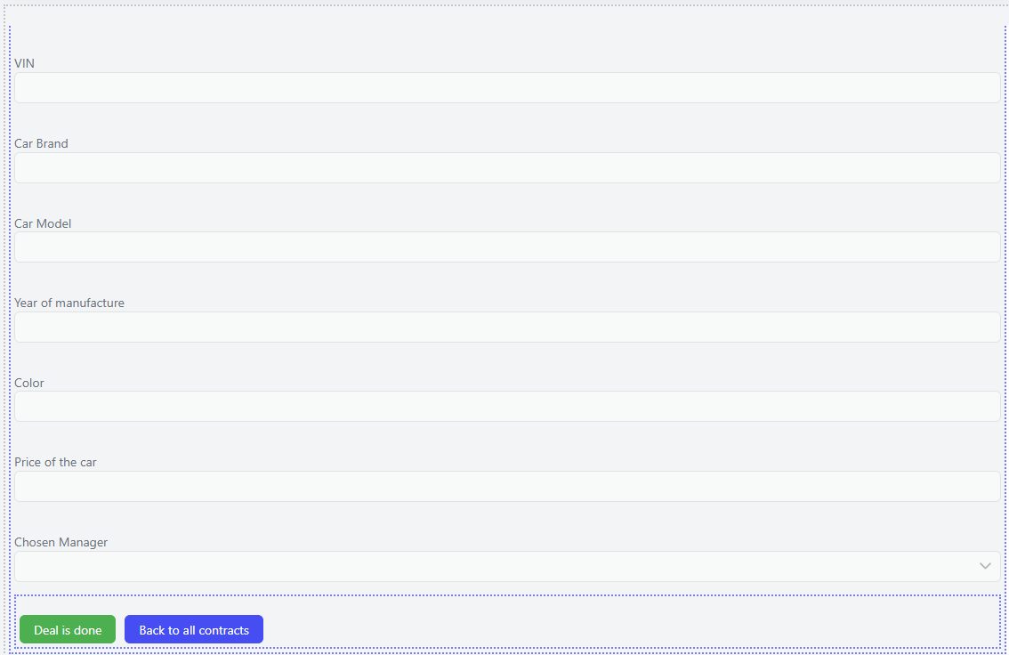 Intenta crear varios gerentes, agregar nuevos coches en venta, asignarles gerentes y tratar de cerrar tratos. Por supuesto, esta aplicación es una prueba; se puede mejorar y hacer más compleja indefinidamente. Después de crearla, puedes usar otras herramientas por tu cuenta, construir lógica diferente y personalizar el diseño a tu gusto. ¡La plataforma te proporciona herramientas flexibles que hacen que el desarrollo sea más emocionante y fácil!