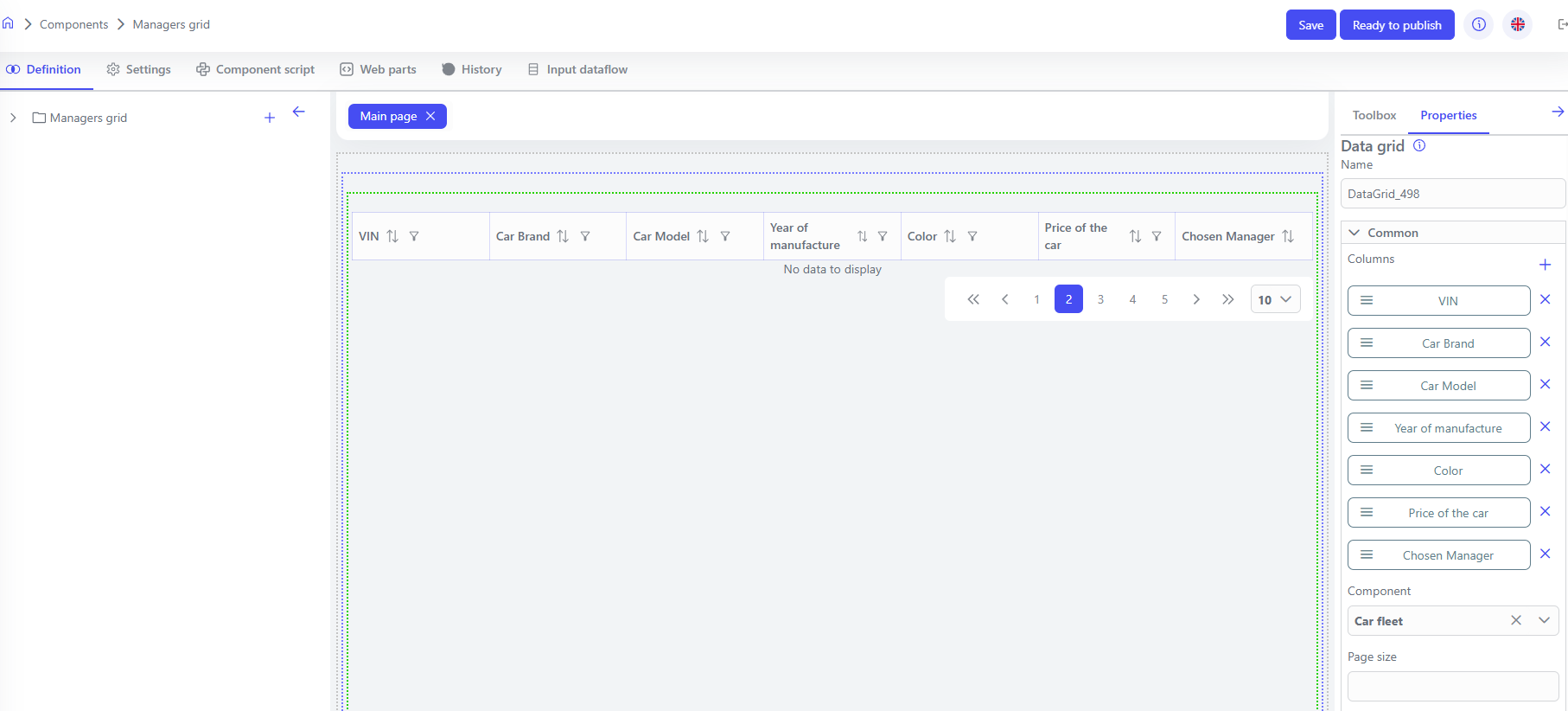 Las funciones get_datagrid_cars y update_cars_success se utilizan para actualizar automáticamente la cuadrícula de datos después de alguna acción. Si no las utiliza, la cuadrícula de datos solo se actualizará después de refrescar la página en el navegador. Después de copiar, necesita guardar el componente y regresar al espacio de trabajo en la "Página Principal".