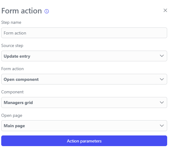 Después de configurar el flujo de datos, vincúlalo al botón de la siguiente manera: ve a la configuración del botón, haz clic en el grupo de configuración "acciones", establece el "tipo de comando" en "ejecutar flujo de datos" y selecciona el flujo de datos que creamos "Agregar un gerente".