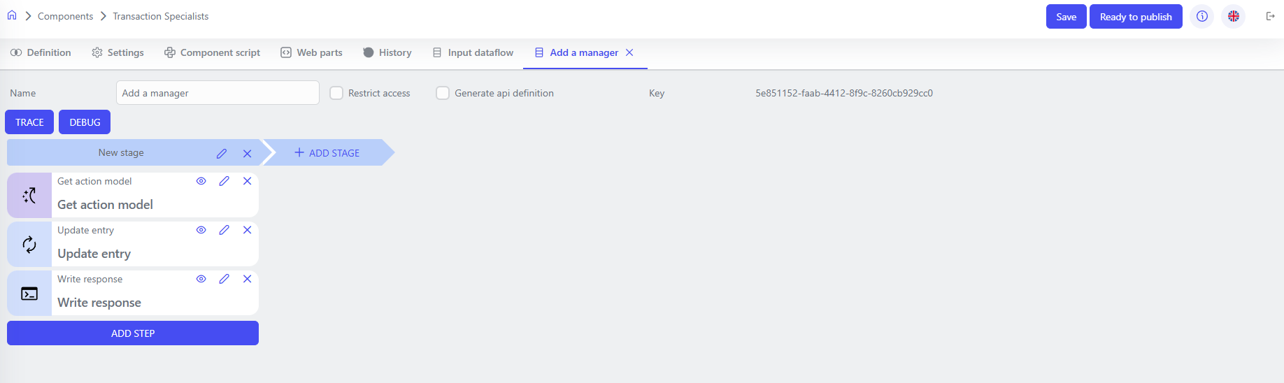 Em seguida, crie um fluxo de dados, nomeie-o como "Adicionar um gerente" e adicione os seguintes passos: get action model, update entry, write response. Deve ficar assim: