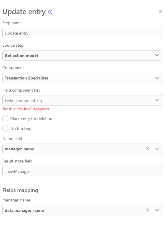 Em seguida, configuramos o passo Update entry, no campo chave do componente especifique o nome do campo do passo Lookup reference: